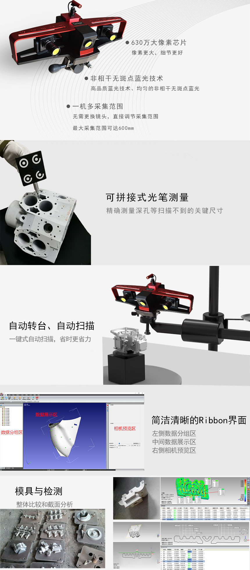 5. 智能數據處理:自主研發的標記點自動去除功能,大幅提高后續補洞處理的效率和質量; 點云一鍵式整體導出為單個數據文件,并自動去除重疊部分, 減少數據量