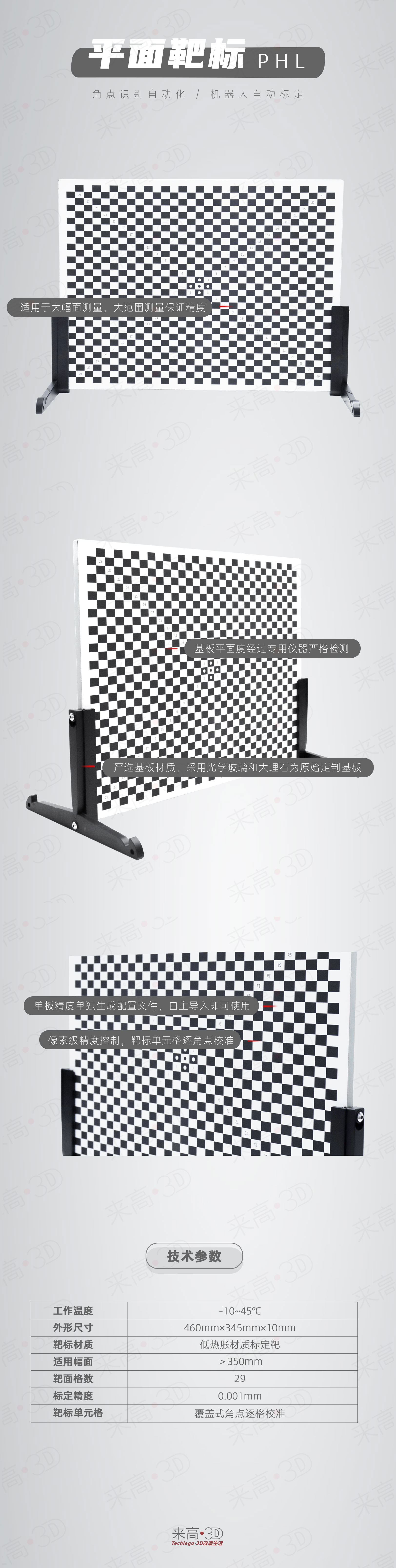 PHL平面靶標采用460*350*10mm低熱脹材質制作而成,每塊靶標出廠前均經過嚴格的平面度校準以及靶面圖案校準。同時其采用自動標定的方式,能大大解放您的雙手并且又大大增加了掃描儀的校準精度。在較大幅面的掃描儀標定,如掃描幅面>350mm時就需要使用PHL平面靶標進行標定,以確保掃描儀的標定精度。所以當您調節掃描儀幅面>350mm時,請您務必采用該靶標校準。