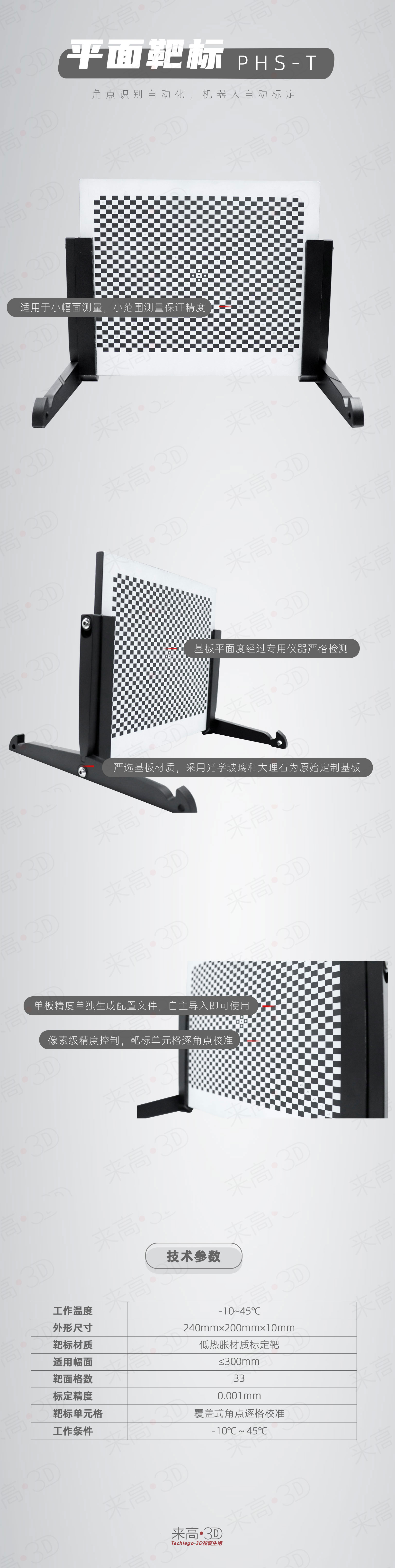 PHS-T平面靶標(biāo)采用低熱脹材質(zhì)制作而成,每塊靶標(biāo)出廠前均經(jīng)過嚴(yán)格的平面度校準(zhǔn)以及靶面圖案校準(zhǔn)。采用非背光的無線設(shè)計(jì),解放了電源線的束縛,同時(shí)其采用軟件按步提示的方式進(jìn)行標(biāo)定,在幅面≤300時(shí),選用該標(biāo)定靶可輕松獲得更好的精度。