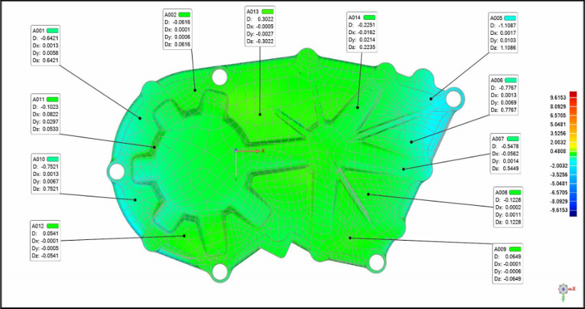 在軟件檢測到采集完成之后,會在軟件中自動對采集數據進行處理,同時和電腦中的圖紙進行自動對比,并自動生成對比報告。生成的對比報告中包含了物體整體的誤差分析,各個視圖的誤差分析報告,同時包含了整個物體上特定點的誤差分析及對比表格。更包含了截面的誤差分析及對比。并且在對比圖中,使用不用的顏色來表示誤差的大小,使局部誤差的大小可以一眼可辨。同時系統會在選定的文件夾中輸出物體的數模數據及文檔版的對比報告。做到逐一存檔,使客戶可以任意查閱。