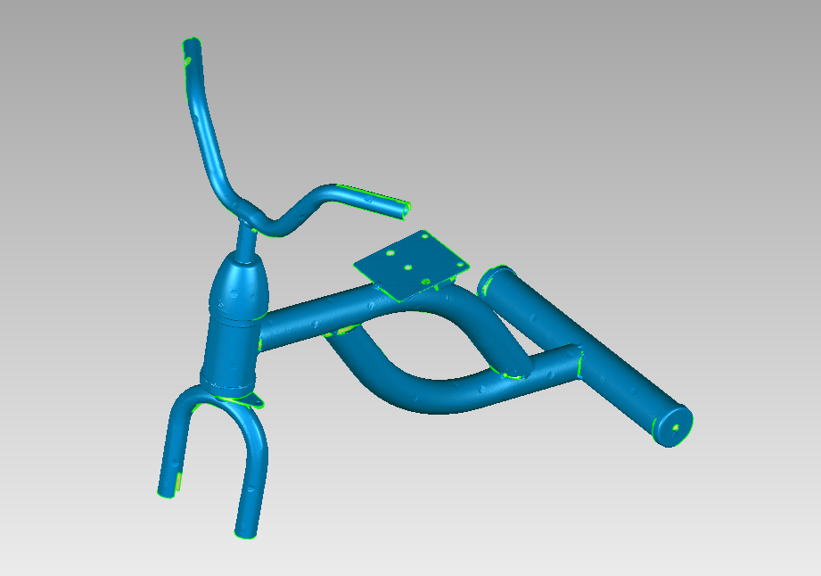 我公司采用三維掃描儀可以輕松檢測車架形變程度,制作是否合格。首先對金屬架子噴涂反差增強劑和粘貼標記點其次對車架表面進行掃描,并對掃描出的數據進行處理。整個過程不到10分鐘,便可以輕松檢測車架的表面信息。