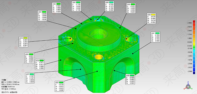 在工業對比檢測中,通過3D掃描儀采集加工完成的成品零件,獲得空間密集點云。再將點云數據與成品零件的原始設計模型進行整體對比,生成偏差色譜、截面、邊界偏差、形位偏差等檢測報告,通過觀察檢測報告分辨零件是否合格,以及超差零部件的后期修復,這就是對比檢測。