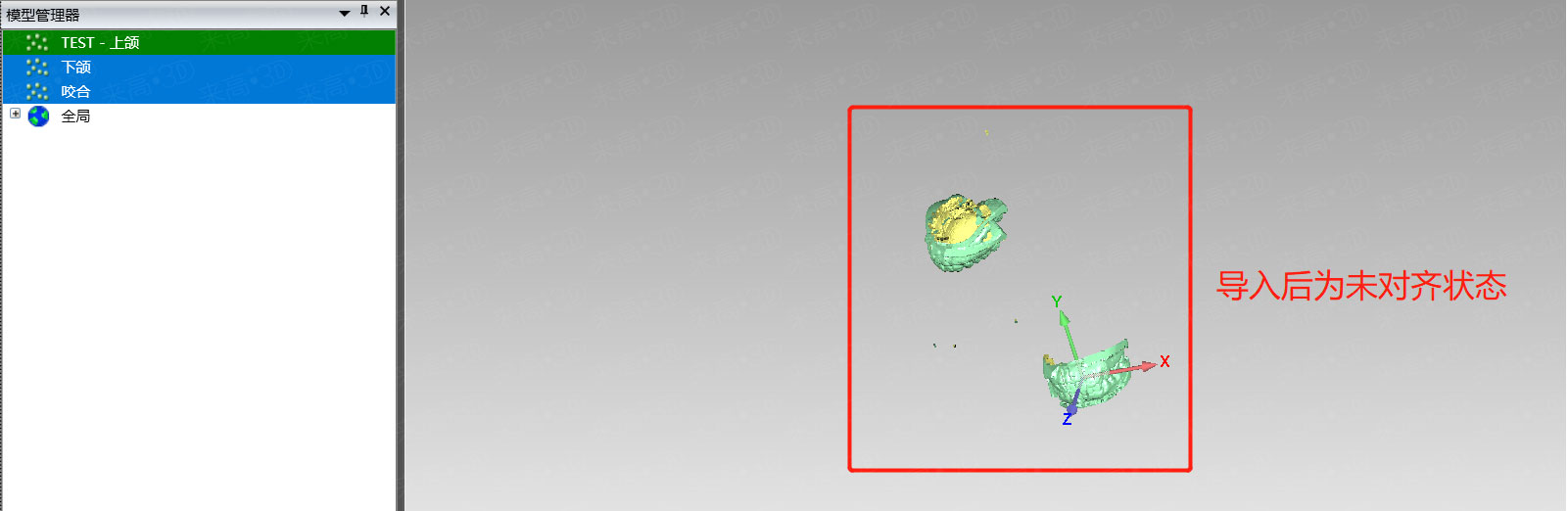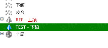01.將上頜數(shù)據(jù)右鍵設(shè)置為“Reference”,將下頜數(shù)據(jù)右鍵設(shè)置為“Test”,模型窗口下右鍵相應(yīng)數(shù)據(jù)即可設(shè)置,設(shè)置好后,如圖所示: