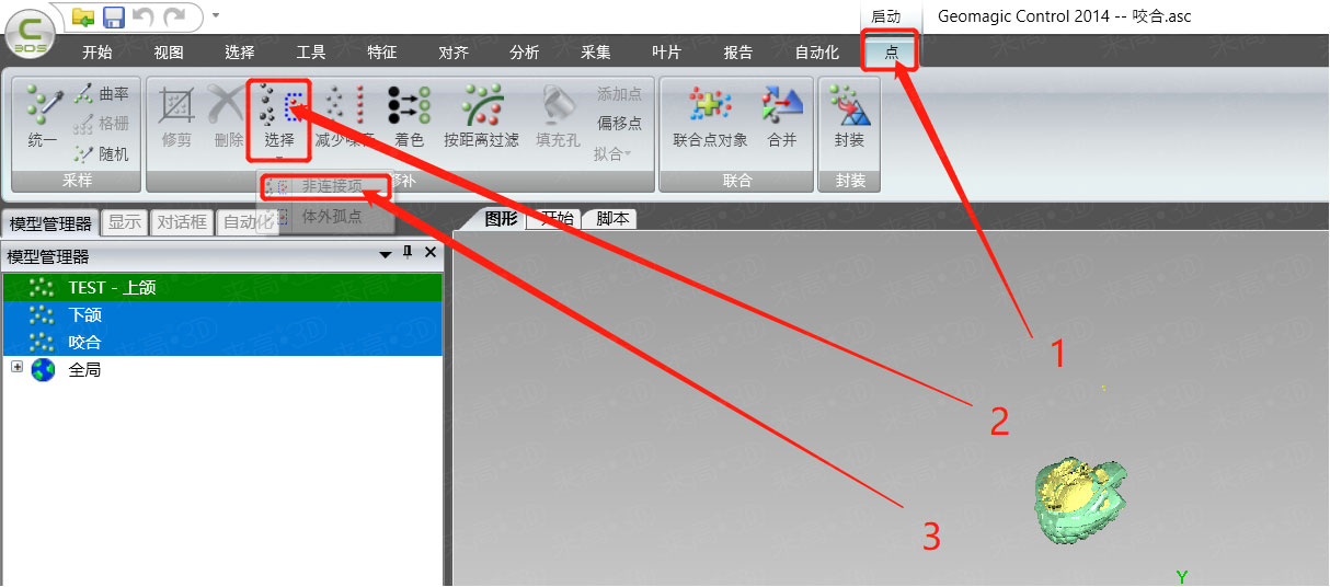 01.首先將來高科技齒科三維掃描儀輸出的ply或asc格式的咬合數(shù)據(jù)、上頜數(shù)據(jù)、下頜數(shù)據(jù),同時(shí)導(dǎo)入至Geomagic軟件中