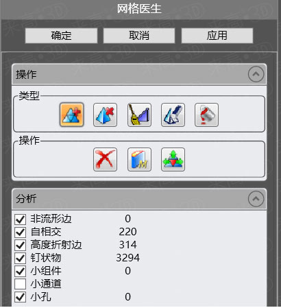 02.封裝好后分別將兩項(xiàng)數(shù)據(jù)進(jìn)行一次或多次“網(wǎng)格醫(yī)生”處理【多邊形→網(wǎng)格醫(yī)生→應(yīng)用→確定】。若應(yīng)用一次后,分析欄中數(shù)據(jù)有未歸零的,則需要再應(yīng)用一次或多次,直至全部歸零