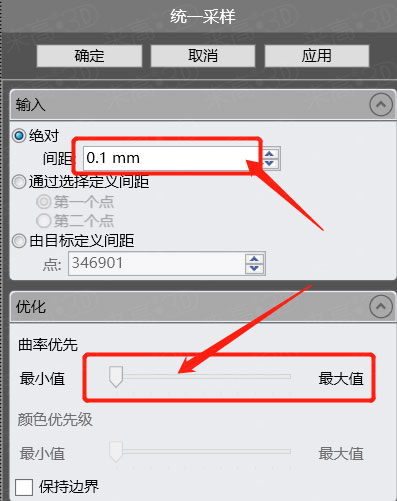 06.將兩部分點(diǎn)云分別進(jìn)行均勻化,使用統(tǒng)一采樣方式【點(diǎn)→統(tǒng)一】,點(diǎn)間距調(diào)整為0.1;細(xì)化后記錄下頜數(shù)據(jù)的總點(diǎn)數(shù)Nocclusal