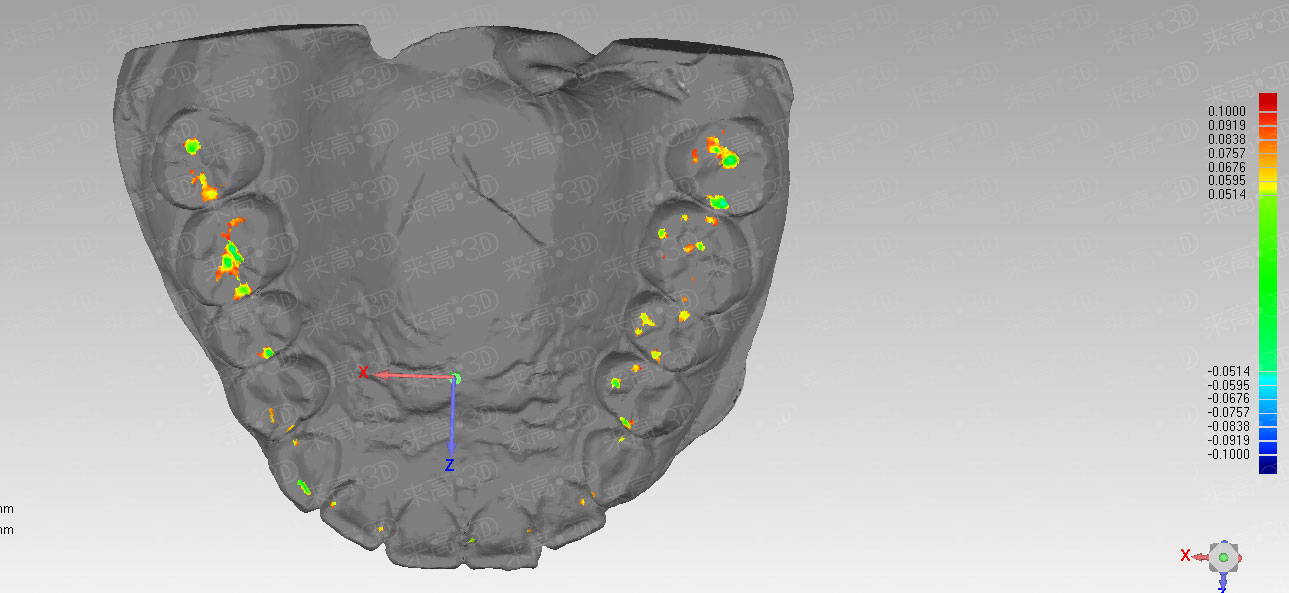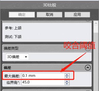 02.進(jìn)行3D比較得到色譜圖,最大偏差設(shè)置為咬合閾值(0.1mm)【分析→3D比較→設(shè)置最大偏差→應(yīng)用→確定】