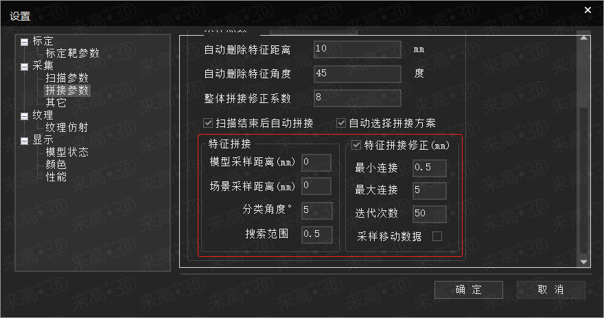 三維視覺系統(tǒng)在引導(dǎo)機(jī)器人定位時(shí),首先要在模板數(shù)據(jù)和當(dāng)前三維點(diǎn)云數(shù)據(jù)之間進(jìn)行特征匹配。為了適應(yīng)不同特征的工件和應(yīng)用場(chǎng)景,來高三維掃描軟件(Techlego)提供匹配算法,并且對(duì)外開放匹配參數(shù)的設(shè)置。匹配參數(shù)主要包含拼接參數(shù)中的特征拼接參數(shù)和特征拼接修正參數(shù)兩部分內(nèi)容,如下圖所示。