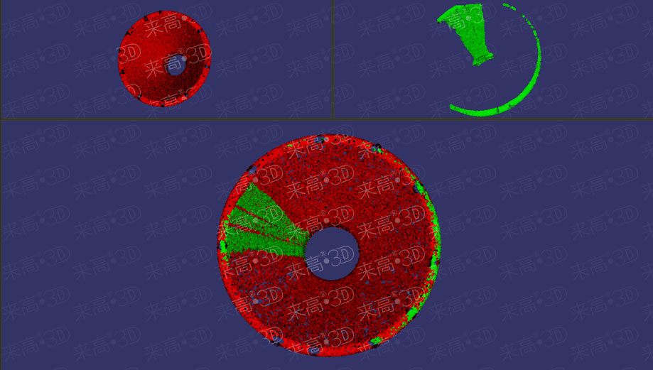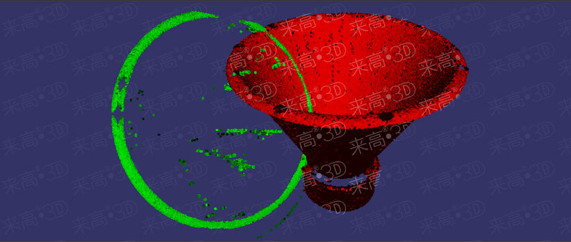 下圖中紅色數(shù)據(jù)為完整的工件模板數(shù)據(jù)模型,綠色部分為當(dāng)前的三維點(diǎn)云數(shù)據(jù)。由于現(xiàn)場(chǎng)環(huán)境的特殊性限制,三維視覺系統(tǒng)只能得到工件開口處的點(diǎn)云,在初次匹配時(shí),由于參數(shù)設(shè)置不合適,模板數(shù)據(jù)和當(dāng)前三維點(diǎn)云數(shù)據(jù)不能準(zhǔn)確匹配。