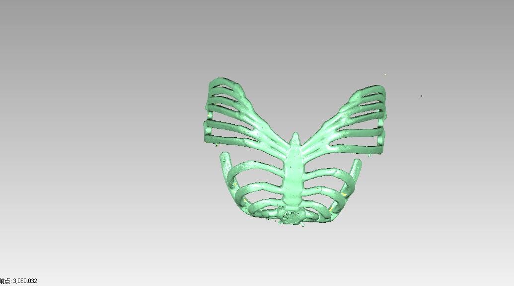 當(dāng)醫(yī)療企業(yè)引進(jìn)實(shí)物模型時(shí),就會(huì)遇到如何獲得該模型的問題。例如肋骨模型相比工業(yè)等領(lǐng)域,他的外形更加復(fù)雜,憑借經(jīng)驗(yàn)將該模型復(fù)制是不可能的。在這種情況之下,我公司的三維掃描儀則會(huì)利用光學(xué)原理將圖一的肋骨實(shí)物的外形進(jìn)行復(fù)制,從而為后續(xù)的逆向設(shè)計(jì)提供了依據(jù)。