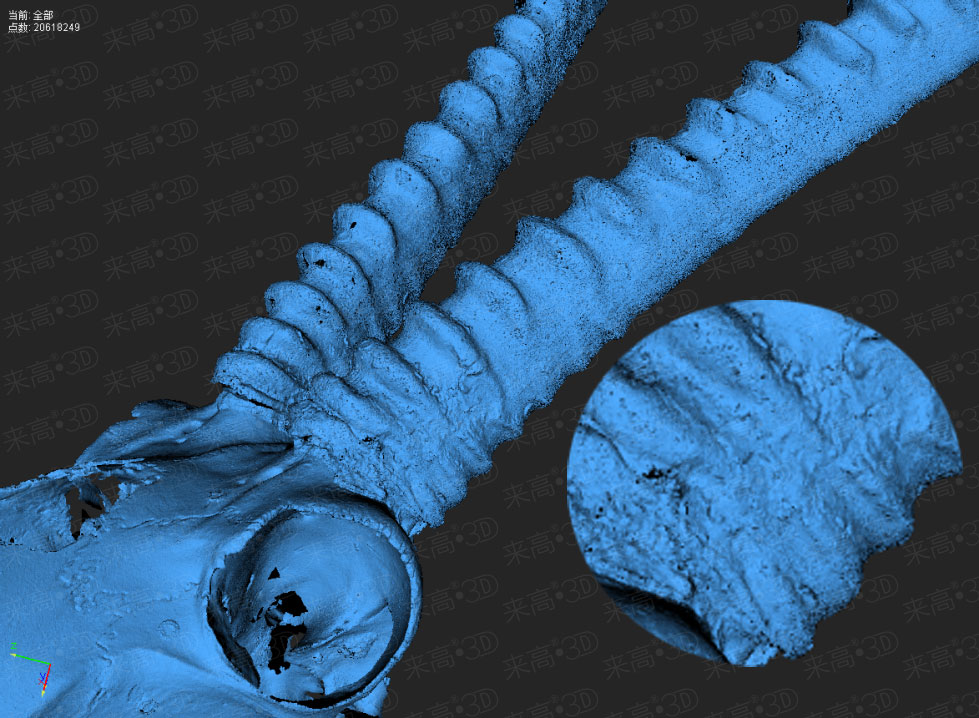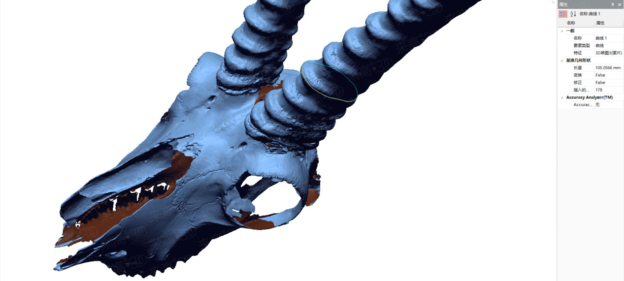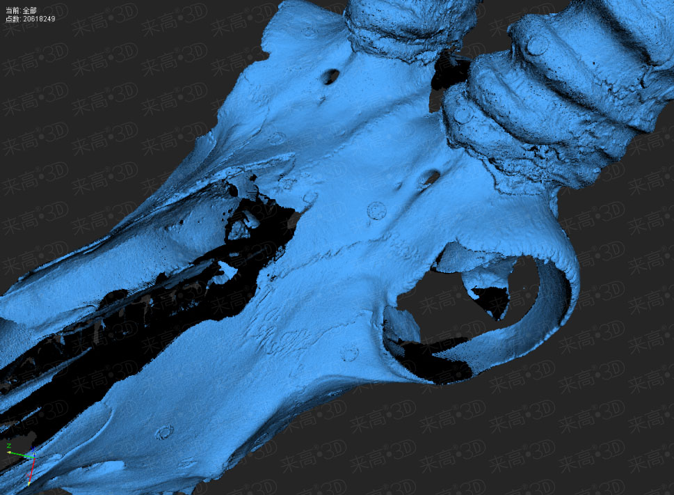 通過三維模型我們可以看出,由于三維掃描儀上點能力很強,羊角即使不在表面噴涂顯像劑,掃描出來的點云質量依然非常好,點云排列密集,頭骨上的裂縫清晰可見。包括羊角環嵴上的脫落層也很清晰。