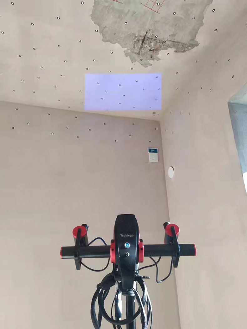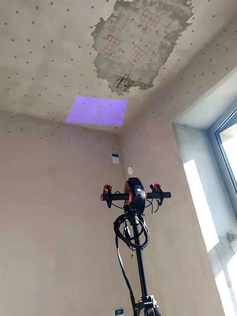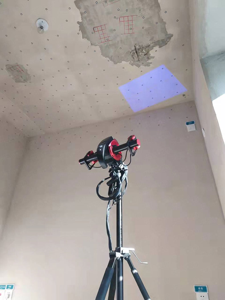 由于待測房屋屋頂尺寸較大,且層高偏高,來高科技采用手持式三維掃描儀Q7對屋頂進行三維掃描,手持式三維掃描儀的優點為高速度、高精度掃描與軟件的高速拼接,通過手持模式與三腳架結合的模式對全屋頂進行整體三維掃描。