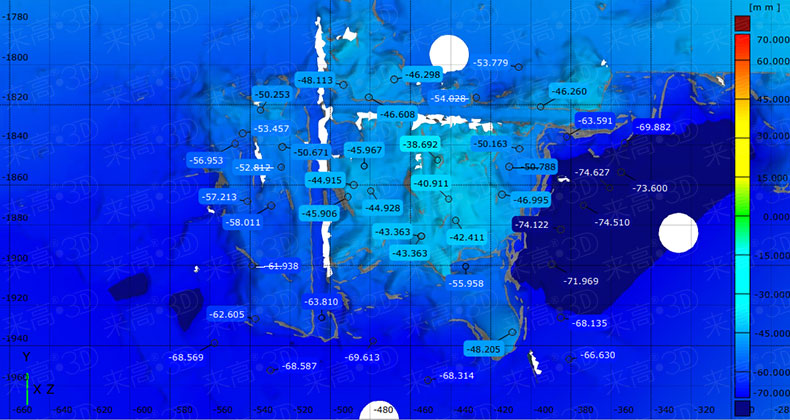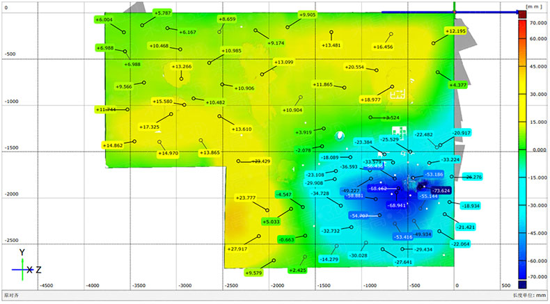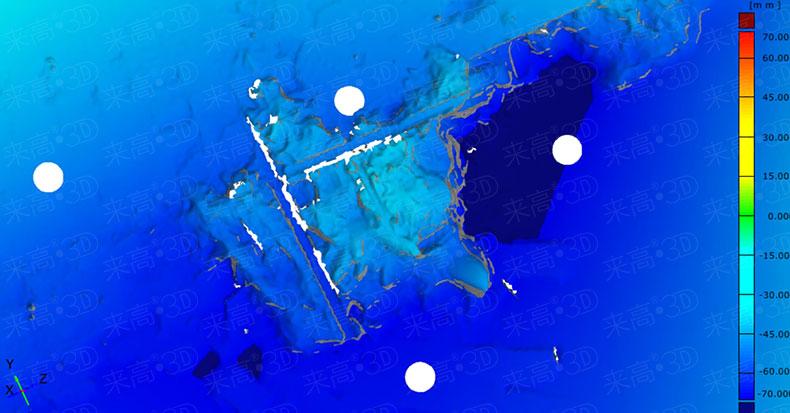 在掃描過程中,軟件自動對多幅掃描引起的累計誤差進行整體拼接修正,提高了工作效率,在1小時左右就完成了全部檢測工作。掃描工作完成后,通過專業檢測軟件對采集到的屋頂數據進行數據分析,包括墻皮的脫落程度、房屋的塌陷程度等,獲得受損部位準確的數據報告。