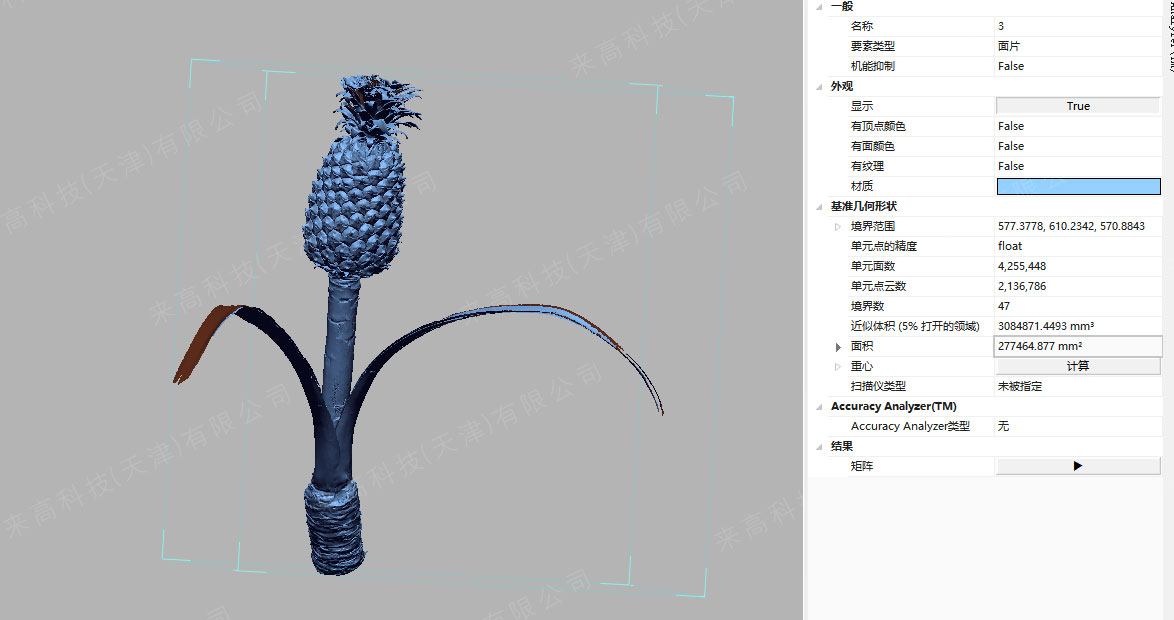 基于菠蘿的三維模型,來高科技可以進行各種測量分析,獲取菠蘿的體積、表面積和截面等信息,這對于研究機構選擇優良品種具有重要的意義。通過這些數據,科研人員可以盡數了解菠蘿的尺寸和形狀等特征以及其他指標,為菠蘿的選育、種植和商業利用等方面提供重要參考。