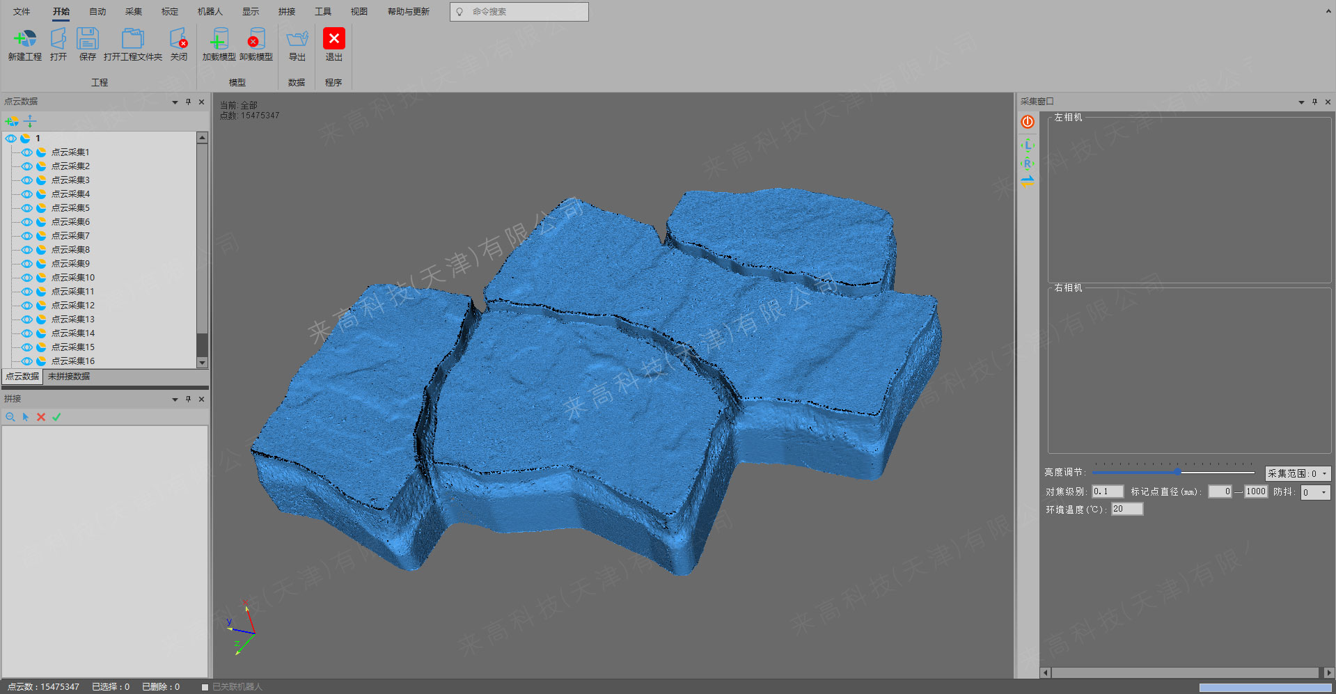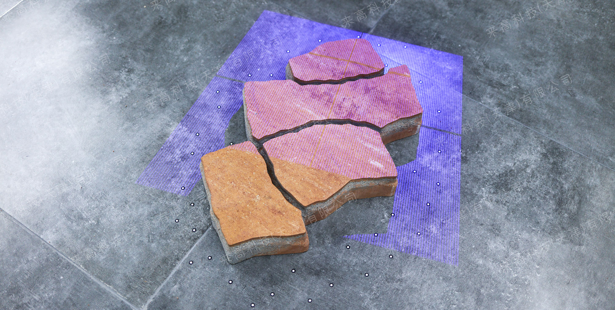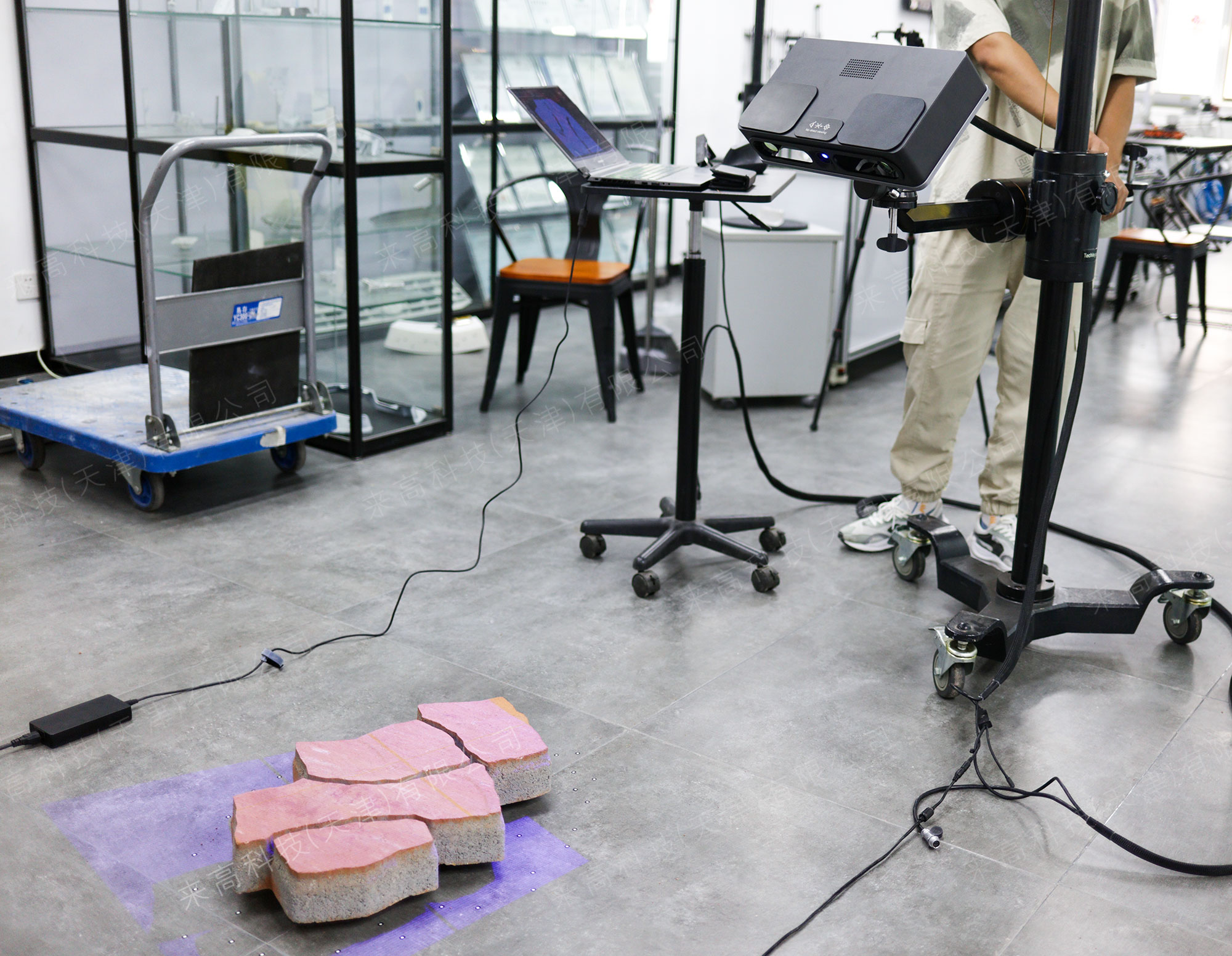 針對異形廣場磚塊結構的特殊性,來高科技選用了G5Q三維掃描儀,該設備以其突出的掃描精度和強大的適應性,能夠從多種角度對磚塊進行多方位掃描,尤其是那些難以觸及的復雜曲面。為確保數據的完整性,利用光筆輔助掃描技術,細致捕捉每個細微特征。