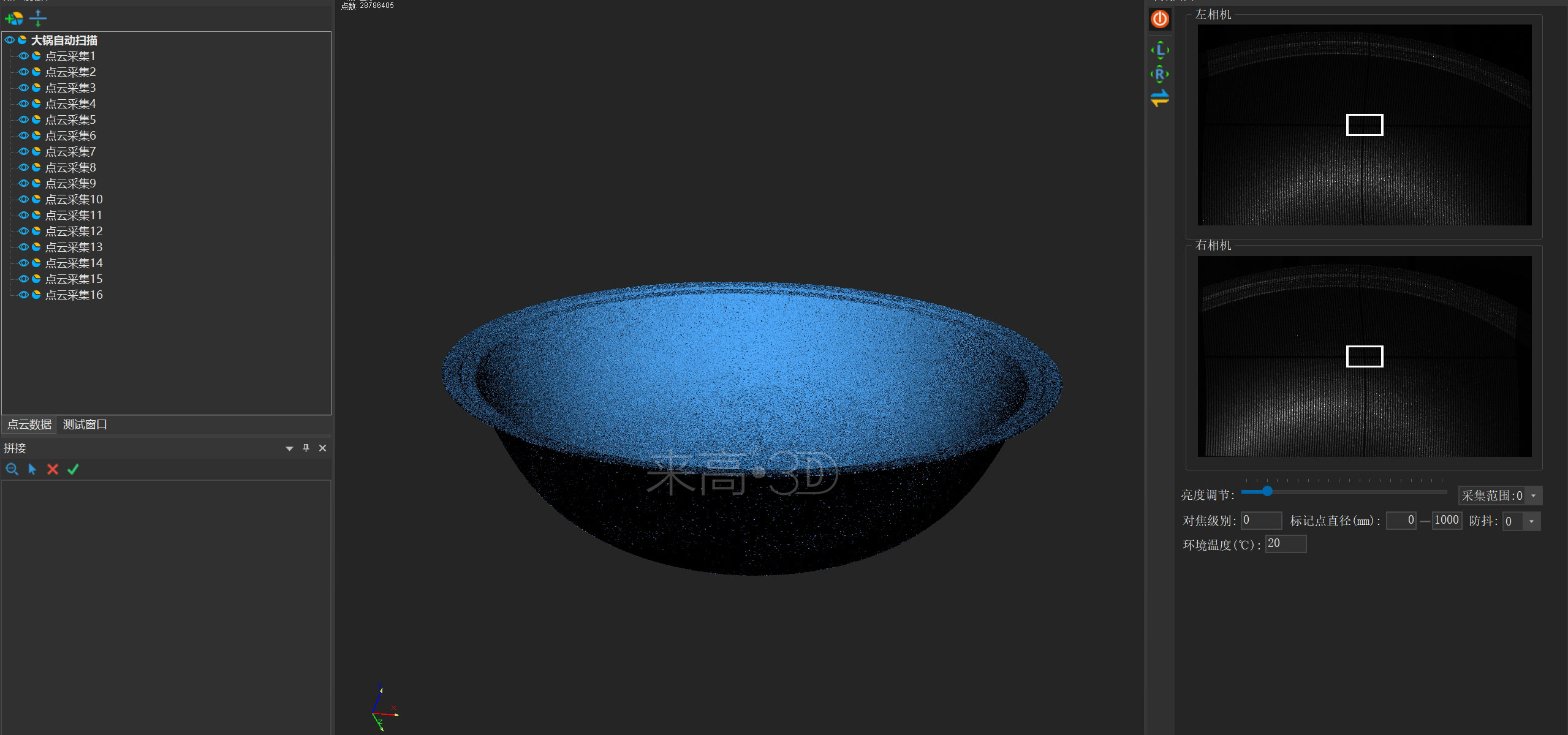選用的G1Q是來高科技Smart-1系列工業級3D智能相機,擁有630萬高像素分辨率和0.6秒高速采集能力,能夠定制化調整采集范圍。該設備還支持通過SDK端口進行主動控制,適用于自動化生產線上的多種任務。